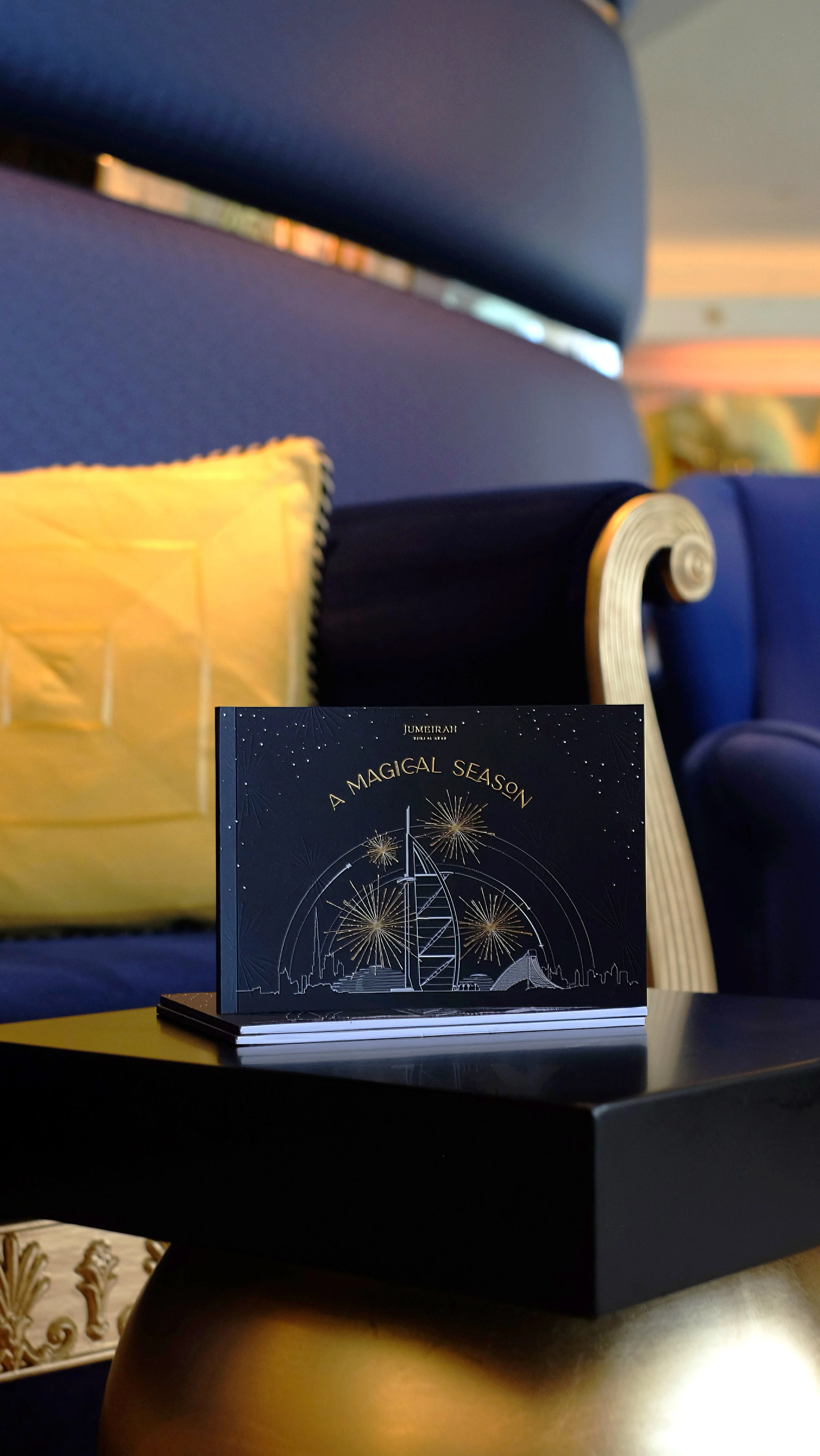 A custom illustration of the Burj Al Arab framed by fireworks brings festive energy while maintaining elegance through restrained line work and embossing. Inside, the layout is structured and spacious, highlighting seasonal events and experiences with clarity and charm - creating a tactile, visually elevated piece designed to delight guests in-suite.